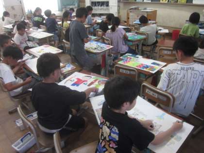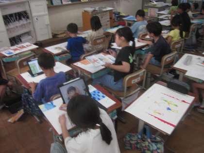図画工作の学習で、5冊の本の中から、自分が選んだ「お話の絵」を描いています。下描きが終わった人から、絵の具やコンテなどを使って色を付けています。自分のペースで工夫しながら、集中して描いていました。絵からお話が伝わるような素敵な作品ができそうです。