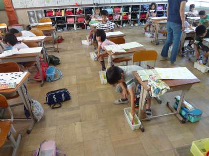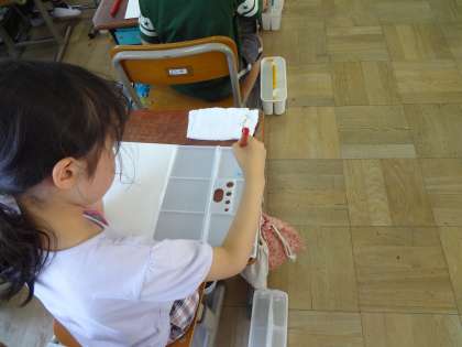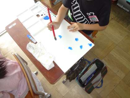 2年生は絵の具を使って図工をしています。今日は初めてだったので,筆洗の水の入れ方,パレットの使い方や絵の具を出す量など細かく確認して,動物の足跡を描きました。