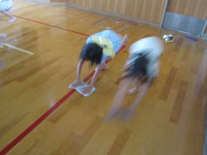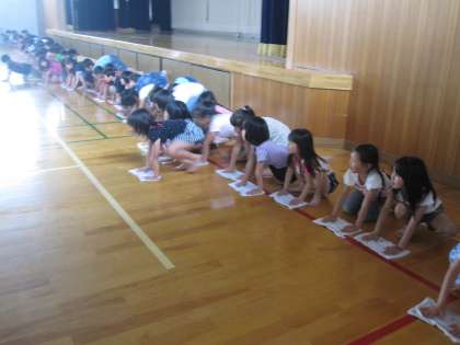 みんなで一斉に広い体育館を一直線に