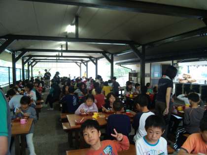3日〈火〉プールの後,炊飯場で昼食を食べました。午後から浦山ラリーの予定ですが,雨が降り続いているので・・・。