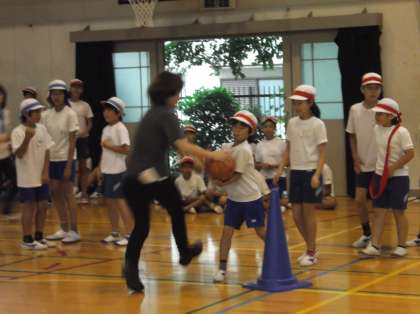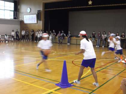 ドリブルリレーはその名の通り,ドリブルをしてみんなから保護者の方へ,保護者の方からみんなへ…とパスがつながり,最後の人がシュートを決めるというものです!!足に当たって転がっていったり,パスがうまくいかなかったり…そこで追い越したり追い越されたり順位が何度も入れ替わり,とっても盛り上がりました!!シュートが決まると応援しているみんなも手を上げて一同に喜んでいました!!