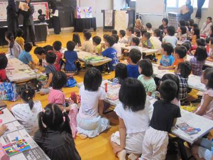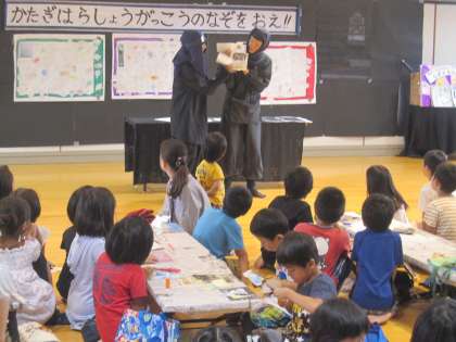 「かたぎはらしょうがっこうのなぞをおえ!」木いちごの会のみなさんに,絵本の読み聞かせやクイズなどで子どもたちを楽しませていただきました。部屋に入れば,周りには忍者がいっぱい。忍者の世界にどっぷりとつかることができました。工作タイムでは,忍者ブック作りにも取り組み,楽しい絵本を作って,子どもたちも満足そうでした。