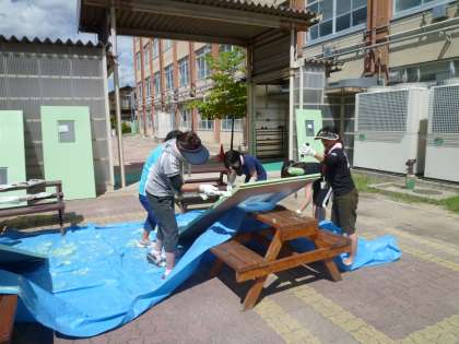 8月21日(火)教職員とPTAの方で,本館の壁のペンキ塗りをしました。上は白,下はうすみどり,一番底は,ブラウンと塗り分けました。