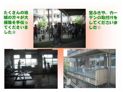 今日は朝会の後に大掃除と草引きがありました!大勢の地域の方が協力してくださいました!窓拭きをしていただきカーテンもつけていただきました☆本当にありがとうございました♪♪