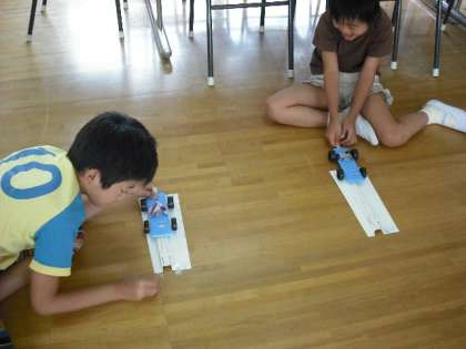 始めはなかなかうまく走りませんでしたが、ゴムが発射台にしっかりひっかかっているか確かめたり、思い切って強く引っ張ったりと、コツがつかめてきました。