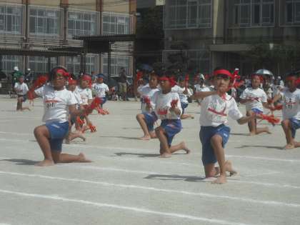よさこいソーランは北海道の民舞で,毎年夏にソーランまつりがあります。タキオのソーラン節の曲にあわせて両手に鳴子を持ってしっかり鳴らしながら踊りました。軽快なリズムにあわせてリズミカルに元気に踊りました。「どっこうしょ,どっこいしょ」「ソーラン,ソーラン」などかけ声をかけながら仲間と心をひとつにしてかっこよくがんばりました。