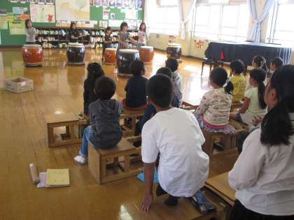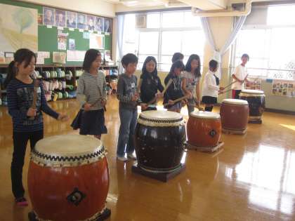 和太鼓部の子どもたちを先生にして実際に太鼓をたたきました。
