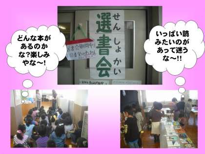 月曜日から第一図書室で選書会が始まりました!子ども達は,色んな本を見て悩みに悩んで本を選んでいます♪また,気になる本を木いちごの方々がその場で読み聞かせをしてくださり,本を選びやすくもなりました☆