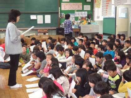 今日は2年生全体で音楽をしました。息の吸い方吐き方や歌うときの立ち方姿勢などを