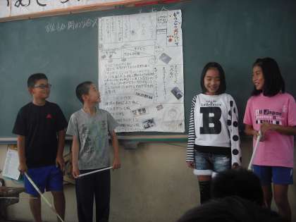 より多くの人とかかわり合うための工夫・身体の不自由な人の役に立つ工夫には,どんなものがあるのかなどを調べ,模造紙にまとめ発表しました。発表会では、お手製の指し棒を作るなどの工夫もしながら、班でしっかりと発表できました。