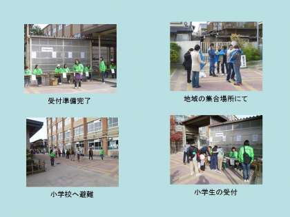 地震発生(想定)直後,地域の集合場所に集まりました。そこで,情報集約と消火・救出・救護等の訓練を行い,小学校へ避難しました。