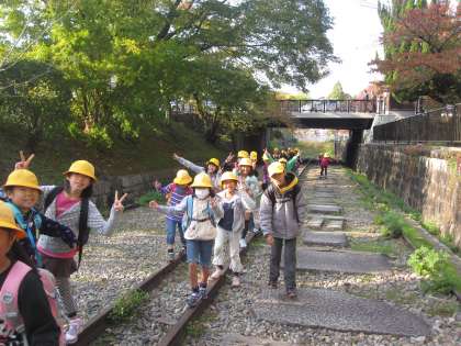 レールの上を歩いたり,石の上をジャンプしたりして楽しそうでした。