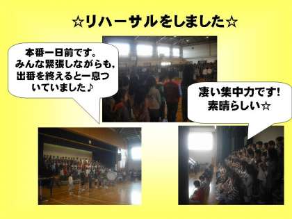 今日は,音楽フェスティバルのリハーサルをしました。明日の本番に向けて,集中力を高めて望んでいました。明日の本番では,今日よりも素晴らしい演奏を楽しみにしています☆
