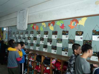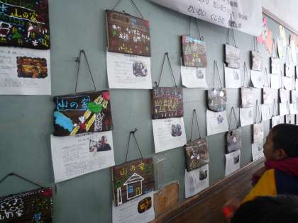 5年生の教室掲示は,山の家で製作した焼き杉を飾っています。