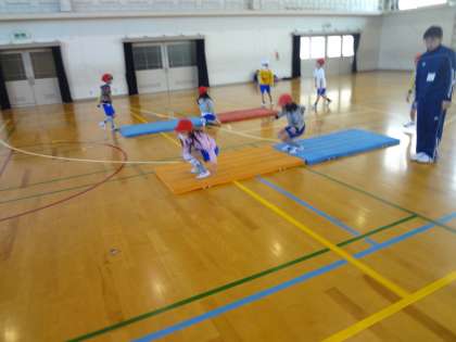 マット遊びでは,前回り・後ろ回り・側転の3つに挑戦しています。前半は自分のできる技をさらにうまくなるように練習し,後半は練習したらできそうな技やできるようになりたい技の練習をしています。
