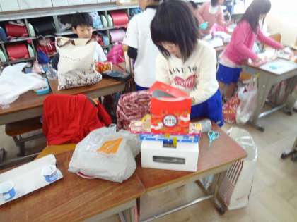 生活科では自分だけのおもちゃを作っています。持ってきた材料からどんなおもちゃを作りたいかを考えました。たおす・ふる・ころがす・たたく・ならべるなど自分でどんなおもちゃを作るかを考えて作り出しました。今日は2回目です。「もっと○○なおもちゃにしよう」とめあてを持って取り組みました。みんな真剣です。