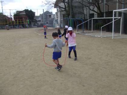 体育の時間に初めてなわとびをしました。自分の肩までの長さがあれば十分で,それより長くならないように調整して跳びました。