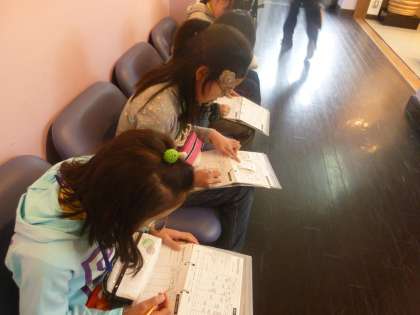 イスに座りながら真剣に書いています。