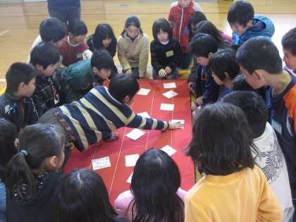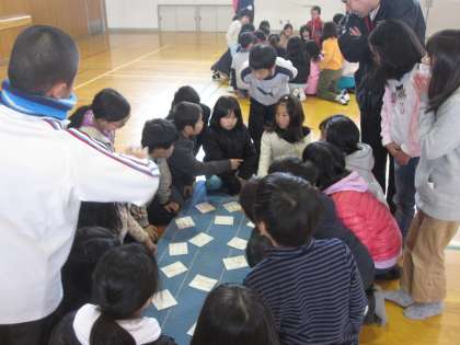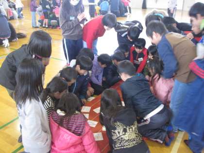 カルタ大会がありました。兄弟学年の3・4年生でチームを作りました。