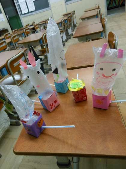 今日の図工は,かさ袋とストローで面白いおもちゃを作りました。牛乳パックから出てくるものは…ロケット・うさぎ・竜・野菜ニョキニョキといろいろなものが出てきてびっくりしました!!「先生見てみて〜!!」とみんな顔を真っ赤にしてふくらましていました。
