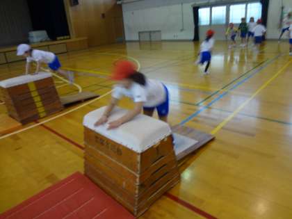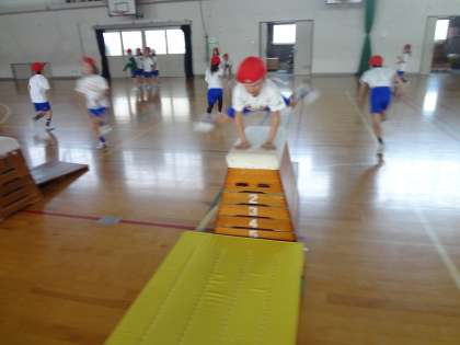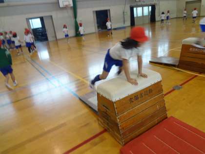 体育ではとびばこあそびをしています。前半は高さに挑戦して,後半は技に挑戦しています。助走の勢いを保ったまま跳ぶ事や手を前に出してとび箱を押すことに気をつけて頑張っています。