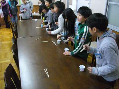 今日は5年生の豆つまみ大会がありました。正しいお箸の使い方をしないと食べ物をつかむことがむずかしいですよね。子どもたちは,コロコロ転がる大豆を割り箸でカップからカップへ一生懸命にうつしていました。