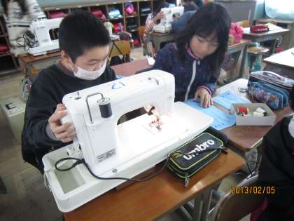 ただ今ミシンに格闘中! 「上糸通して,下糸入れて,スタートは針を下ろしてから押さえをおろす・・」初めてのミシンにただいま格闘中!うまくいったら見守ってる友達と笑顔がはじけます。