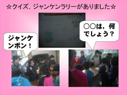 2月8日金曜日の中間休みとお昼休みにニュース委員会の子ども達が主催した,クイズ,ジャンケンラリーをしました!クイズに一生懸命に答える様子や,メモをとる様子の眼差しは,真剣そのものでした☆楽しそうにしていたので嬉しく思いました♪