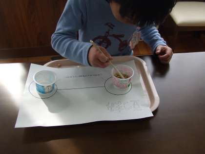 7日の中間休みには1・2・3年の豆つまみ大会がありました。1分でいくつつかめるか競争でした。各クラスの代表1人がランチルームで挑戦しました。1位は22個でした。