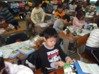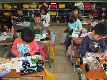 タイヤをペットボトルや,牛乳パックにつけて,ころころ転がるようにしました。材料をたくさんそろえてみんな楽しそうに,作っていました。来週には完成させみんなで転がしてみたいと思います。