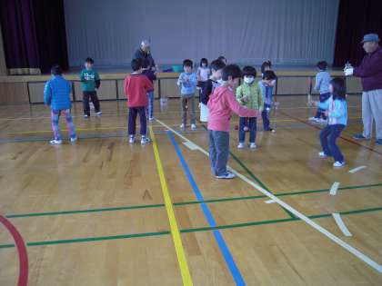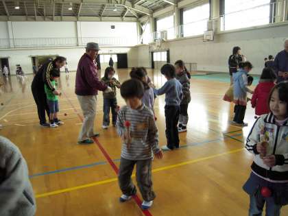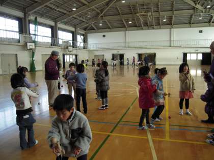 体育館で,けん玉とこまをしています。こまは,ひもをうまくまけなくて,なかなか回らないようでした。けん玉が初めてという子には,持ち方から教えてもらいました。学童でけん玉に取り組んでいる子は,体を上手に使って上手にいろいろな技を見せてくれました。