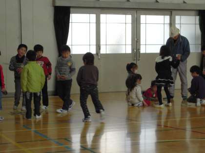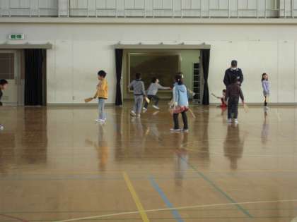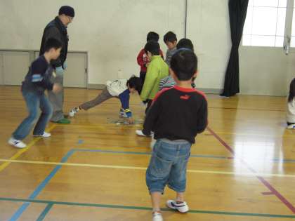 はねつきとめんこをしています。はねつきのコーナーでは,「カーン」という気持ちのよい音がしていました。二人組みでやっていましたが,続けて打つのはなかなか難しいようでした。めんこは,5人ぐらいのグループに分かれて,順番を守って取り組んでいました。うまくめくれると「やったぁ!」と歓声があがっていました。