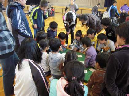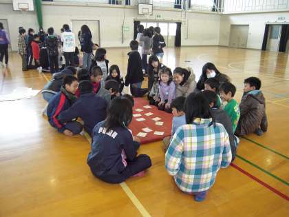 14日のわくわくタイムにかるた大会がありました。ペアの6年生にサポートしてもらいながら,1年生が札を取りました。白熱した勝負の結果,1位は3組,2位が1組でした。