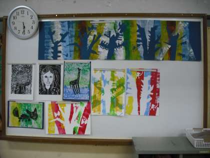 それぞれの学年が版画に取り組みました。2年生は紙版画、3年生はスチレン版画、4年生と6年生は木版画です。「それおもしろいなあ。」「そっちもやってみたいなあ。」「6年生になったら同じのができるかな。」と、お互いに興味津々です。紙版画の版をつかって、長い共同作品も作りました。