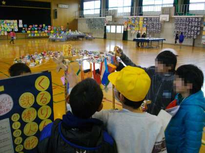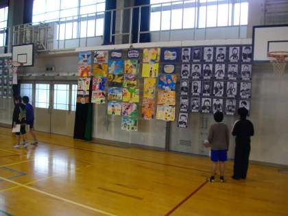 体育館で図工展が開かれています。子どもたちは,学校のみんなの作品を鑑賞しにいきました。友だちの作品の良さや発見したことなどを鑑賞カードに書きました。地域の方の作品も展示してあり,子どもたちはその出来栄えに感動していました。