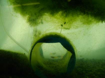水槽の中でじっとしているメダカたち。メダカは冬ほとんど動きません。エサを与えた時は少し水面まで上がってくるくらいです。