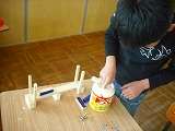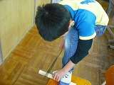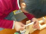 3年生の図工は、木を使った工作です。のこぎりで切って、ボンドで組み立てて、釘でかざりや部品をつけていきます。はじめはなかった切れなかったのこぎりも、だんだん上手になってきました。