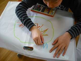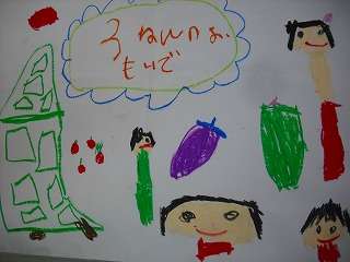 作品ぶくろを作りました。まず、「○ねんせい」と書くところでは、「えっ?○年生と書きたいな」と、もうすぐ進級する上の学年を言っている人もいました。今から進級が楽しみですね。かしのみの畑でつくった野菜や、友だちの顔、みんなででかけたバスなどの絵をかきました。