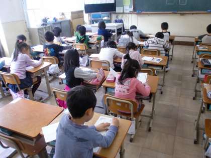 正しい鉛筆の持ち方で,正しい姿勢に気を付けて初めて自分の名前を書きました。 机の上に貼ってある名前シールとにらめっこしながら丁寧に書きました。色付けをして素敵な名前カードができました。