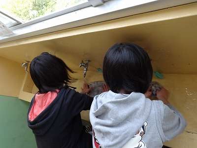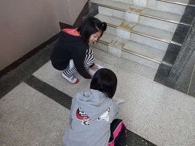 去年から給食配膳中のろうか・階段ふきふき隊が