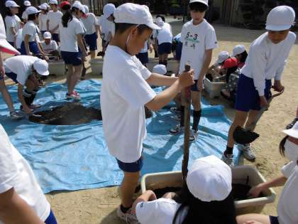 種まきのための土づくり,そして,プランターに均等に土を入れて種まきの準備をしました。