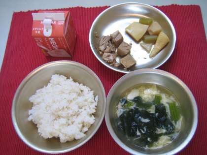 今日の給食は胚芽米ごはん・なまぶしとふきのにつけ・かきたま汁・牛乳でした。学校給食ではいろいろな食材を知ってほしい、季節の食べ物を知ってほしいという思いがあり,毎年4月にこの献立が出ます。
