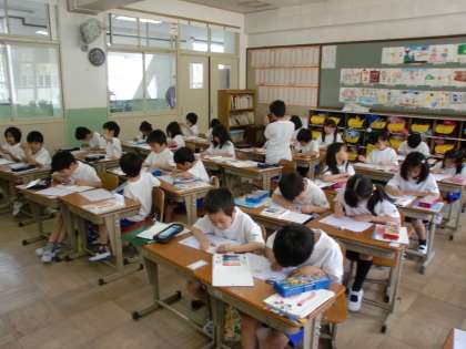 正しい鉛筆の持ち方で,良い姿勢に気を付けて平仮名の練習をしています。「つ」「く」を習いました。