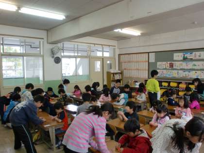 6年生に折鶴の折り方を教えてもらいました。優しく丁寧に教えてもらい,出来上がった折鶴を得意そうに友達に見せていました。この折鶴は6年生が修学旅行で平和記念公園に捧げます。