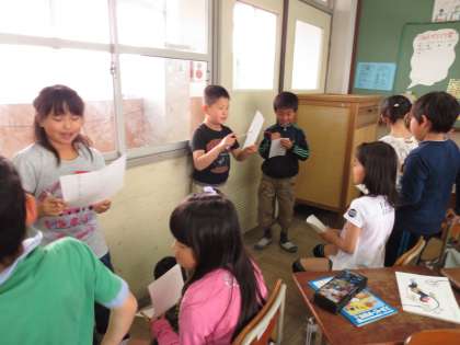 半分に分かれて,ニュースを聞く人が椅子に座って回っていきます。何度も読むので,