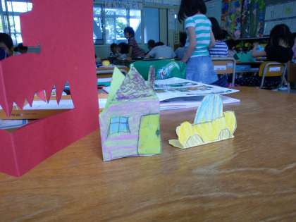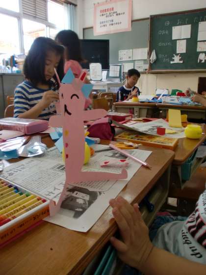 画用紙を折って切り抜き,「ゆめのまち」に立てて飾れる作品を作りました。