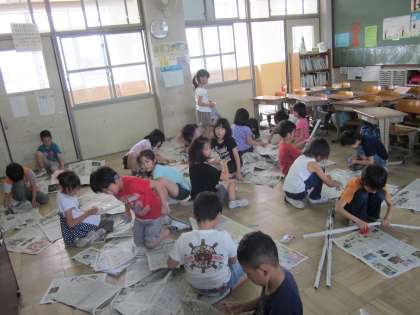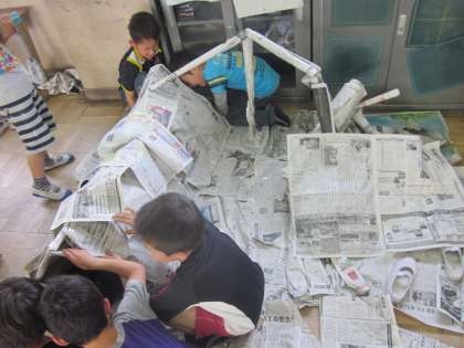 今日の図工では,新聞紙を使いました。新聞紙を丸めたり,ひねったり,しきつめたり,つなげたりといろいろな方法でものを作りました。