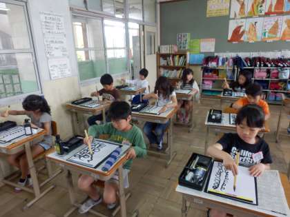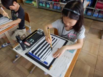 「太さを変えるのがむずかしい〜」と言いながらも,はじめての毛筆学習に楽しんで取り組むことができました!!