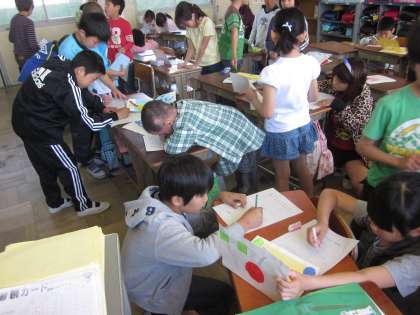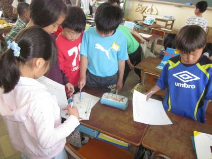 図工で作成した「とび出すメッセージ」の鑑賞を行いました。友達の作品をみてまわり,工夫や良い点を見つけあいました。自分の作品を見せることに照れながらも,遠くから友達が自分の作品を鑑賞しているのを見て喜んでいる姿は微笑ましかったです。