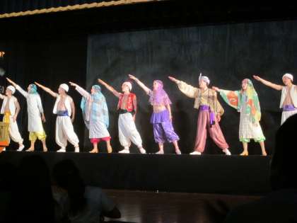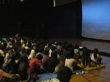 本日は劇団ポプラの皆さんが,『シンドバッドの大冒険』の公演を行いに来て下さりました。最初は室内の蒸し暑さにやられていた子どもたちでしたが,公演が始まると,歌とダンスに次第に引き込まれていました。